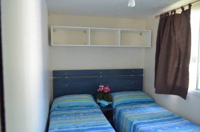 Casa mobile trilocale; aria condizionata; 1 camera con letto alla francese; 1 camera con 2 letti singoli; area giorno con angolo cottura (NO pentolame); frigo con piccolo freezer; dinette; tv; due bagni separati, uno con cabina doccia e lavandino e l’altro con servizi. Veranda esterna attrezzato con tavolo e sedie.