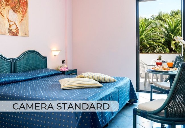 camera al piano terra, piano rialzato, 1° o 2° piano;  letto matrimoniale; aria condizionata; tv; cassetta di sicurezza; minibar, con consumazioni su richiesta a pagamento; bagno con vasca o doccia e bidet; asciugacapelli. Eventuale 3° posto letto singolo. Area verde se al piano terra, balcone se ai piani attrezzato con tavolo e sedie.