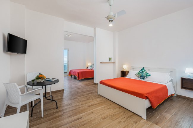 alloggio in muratura; aria condizionata; 1 camera con letto matrimoniale; 2 camera con letti singoli; minifrigo (vuoto ad uso degli ospiti); tv; bagno con box doccia. Eventuale 5° posto letto in area giorno. Patio, ballatoio o terrazzino attrezzato.
